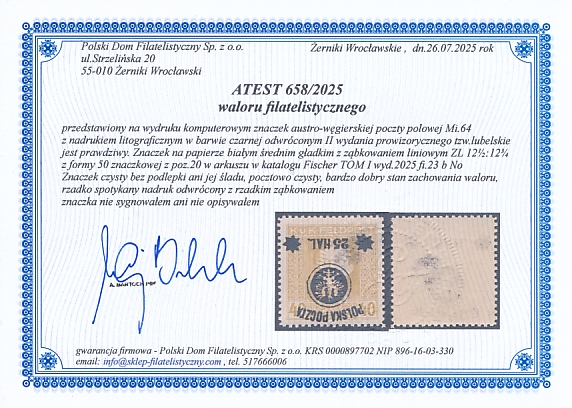 znaczek czysty bez podlepki ani jej śladu z nadrukiem odwróconym z ząbkowaniem 12½:12¾ w katalogu Fischer TOM I wyd.2025 fi.23 b No to bardzo rzadka spotykana odmiany ząbkowania na znaczku z nadrukiem odwróconym , gwarancja firmowa. Widoczne ślady farby spotykane na skrajnych znaczkach w arkuszu
