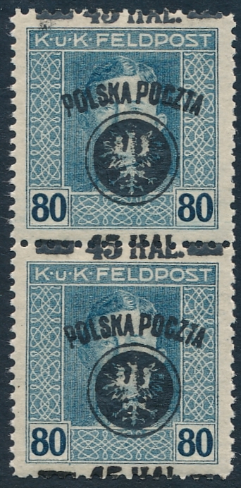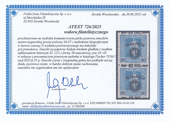znaczki czyste bez podlepki ani jej śladu w parce pionowej z przesunięciem pionowym nadruku w dół z rzadkim ząbkowaniem liniowym ZL 12¼ z poz.35+45 w arkuszu z formy 50-znaczkowej, nadruk w barwie czarnej w katalogu Fischer TOM I wyd.2025 fi.25 a gwarancja firmowa Andrzej Bartoch PDF - Polski Dom Filatelistyczny. Bardzo ciekawy i rzadki walor z uwagi na rzadką perforację oraz duże przesunięcie nadruku który znajduje się na perforacji pomiędzy znaczkami. Znaczki pocztowo czyste w bardzo dobrym stanie zachowania. |