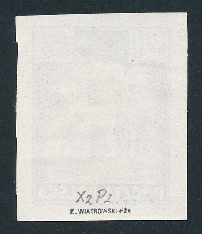 próba czysta bez podlepki ani jej śladu w barwie ciemnoliliowej na papierze cienkim gładkim satynowanym , sygnatura na rewersie |