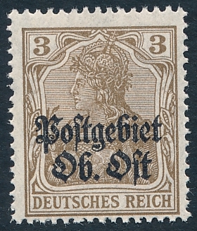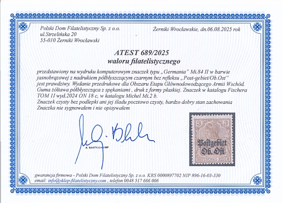znaczek czysty bez podlepki ani jej śladu typu "Germania" Mi.84 II w barwie jasnobrązowej z nadrukiem półbłyszczącym czarnym bez refleksu "Post-gebiet/Ob.Ost" w katalogu Fischer TOM II wyd.2024 - 18 c, w katalogu Michel 2b , gwarancja firmowa Andrzej Bartoch PDF |