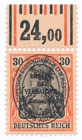 znaczek czysty z śladem po podlepce w barwie pomarańczowoczerwonej/czarnej ( Mi.89 II ) z nadrukiem typograficznym Drukarni Państwowej w Berlinie z 1920 roku z górnym marginesem wysoka dopłata za margines ( OR ) wg katalogu Michel , gwarancja firmowa z opisem Andrzej Bartoch PDF ( Polski Dom Filatelistyczny ) |